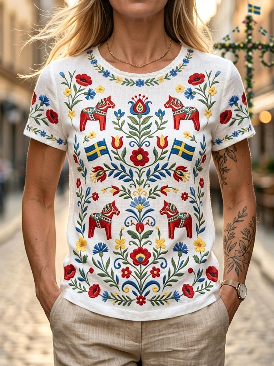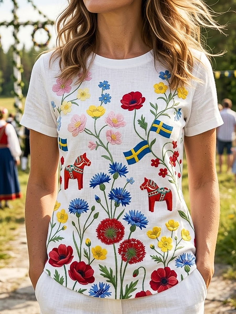 Dams retro svensk gungtupp midsommarblommig casual t-shirt