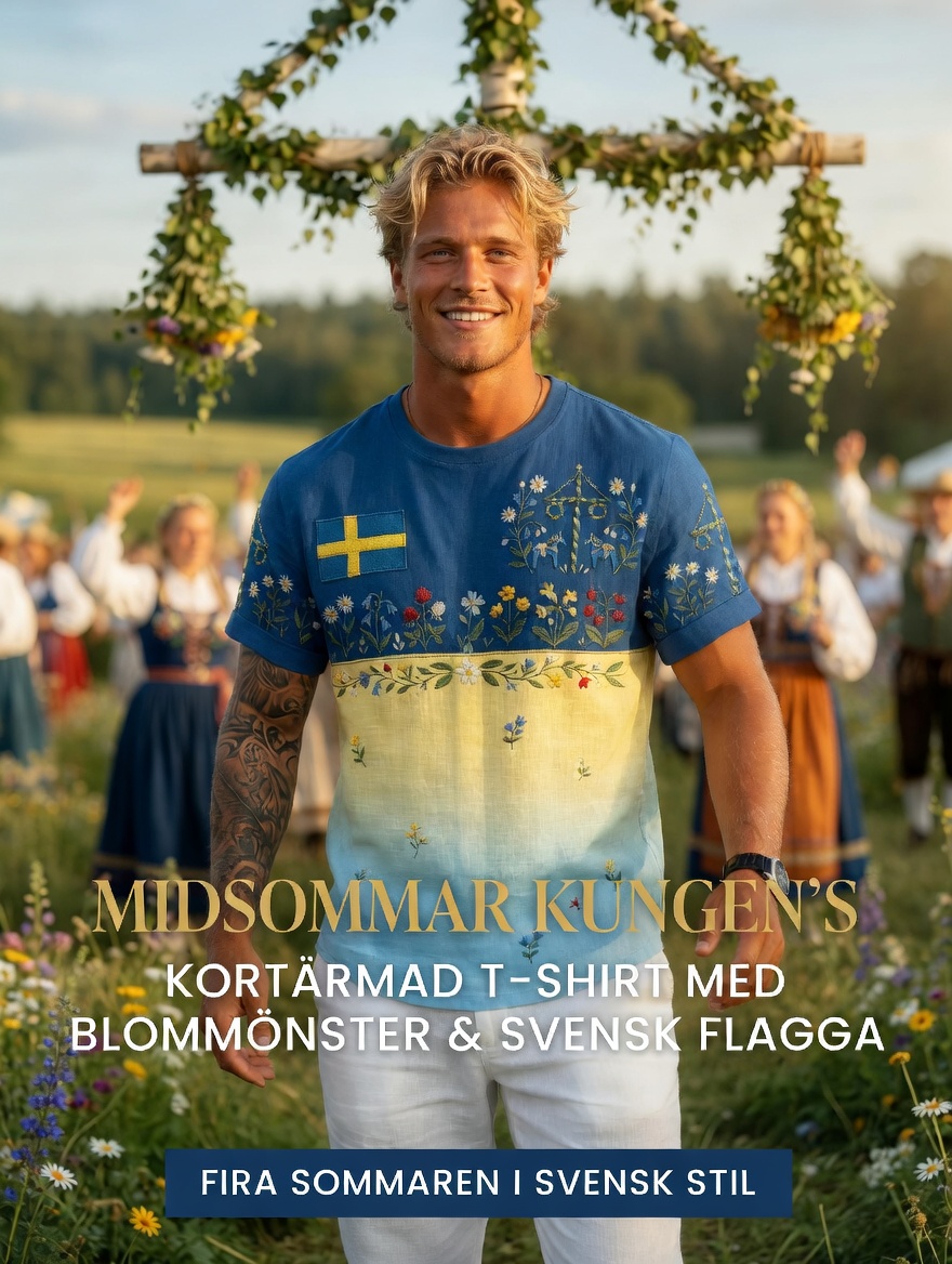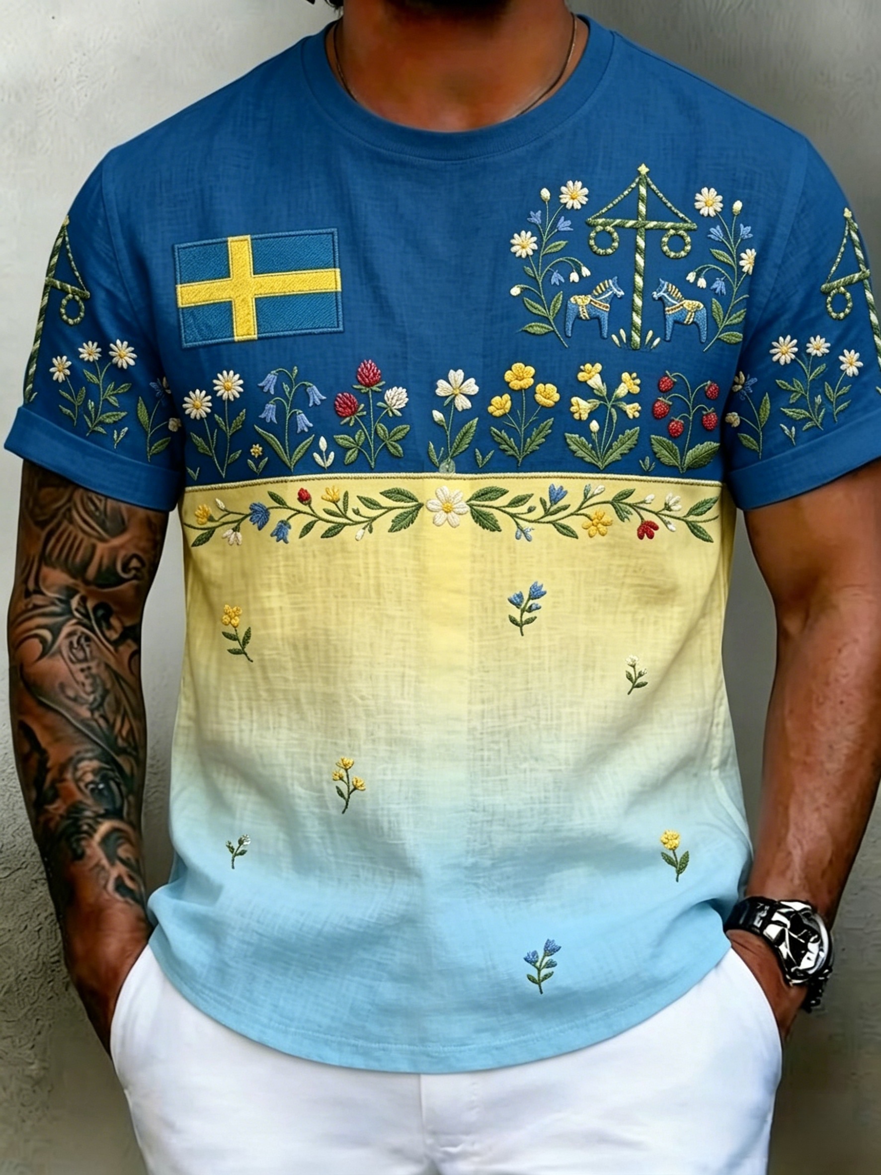 Herrretro svensk midsommarfolkalinsk bomull-linne t-shirt med korta ärmarna