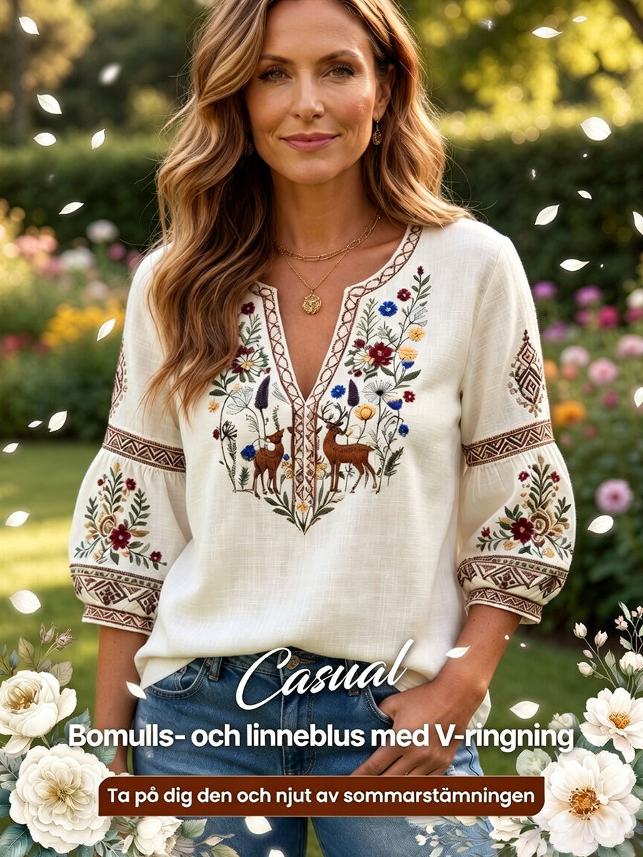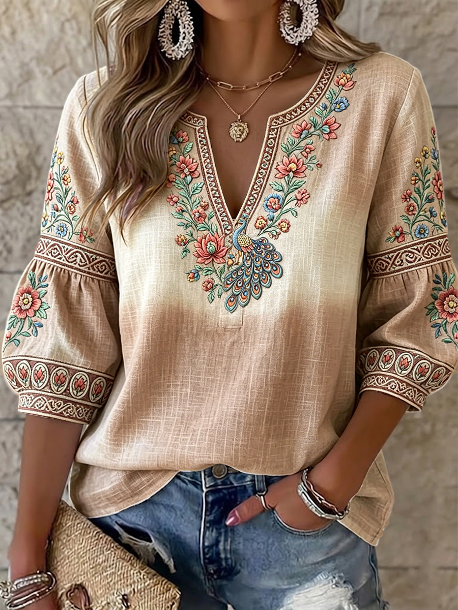 Dams mörkningstrendigt traditionellt blommig och fågelmönstrad avslappnad T-shirt i bomull-linne med V-ringning