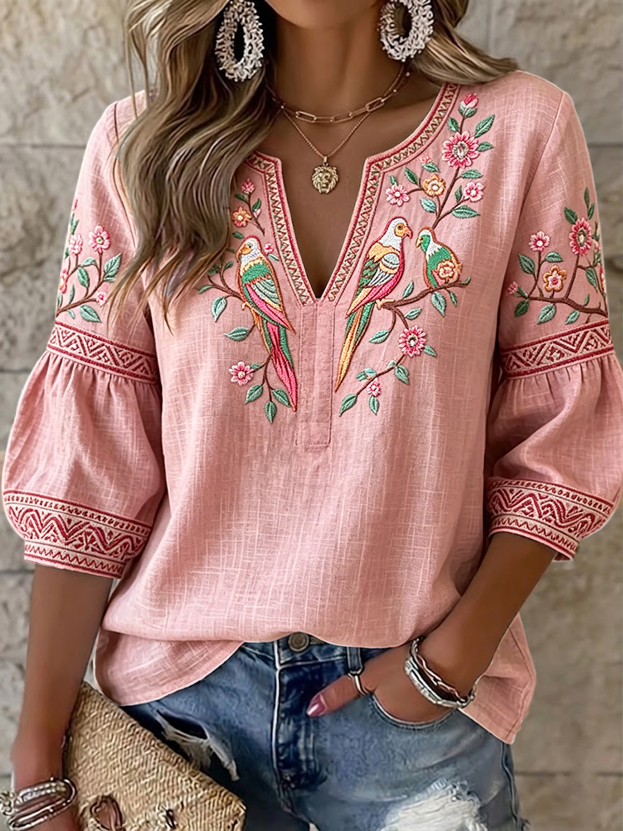 Dams T-shirt i rosa med traditionellt blommönster och fåglar, 3D-tryckt, av bomull-linne, med V-ringning, i ledig stil