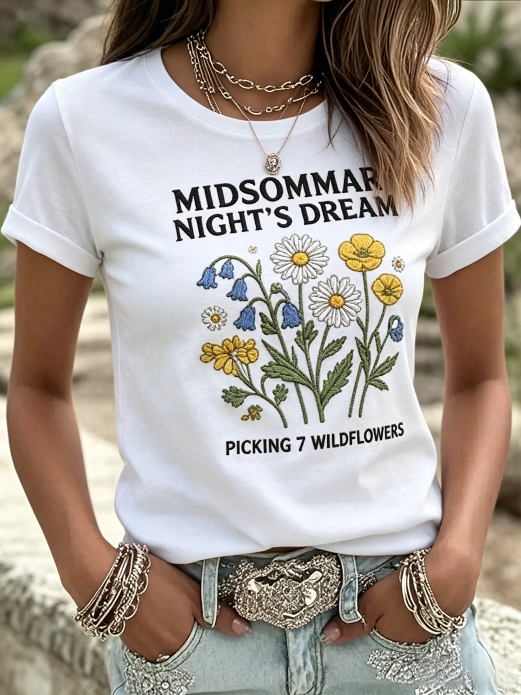 Retro svensk midsommartryck avslappnad t-shirt med korta ärmarna