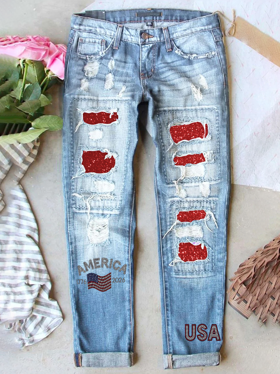 Women's Retro American Independence Day Denim Patch Printed Denim Jeans