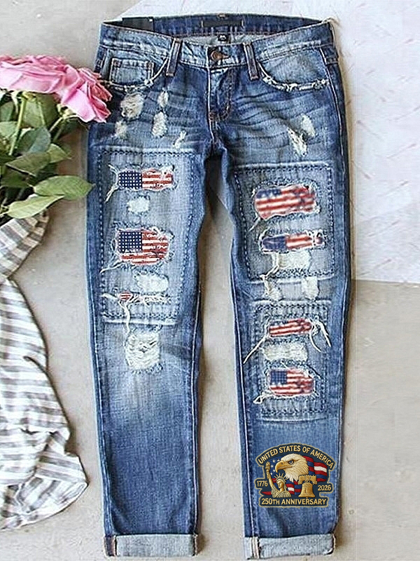 Women's Retro American Independence Day Denim Patch Printed Denim Jeans