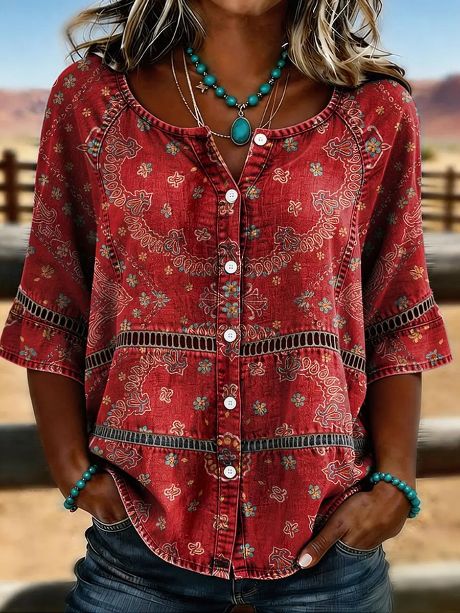 Women's Vintage Floral Print Casual Hollow-Out Shirt