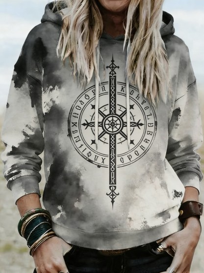 Women's Vintage Nordic Viking Art Printed Hooded Sweatshirt