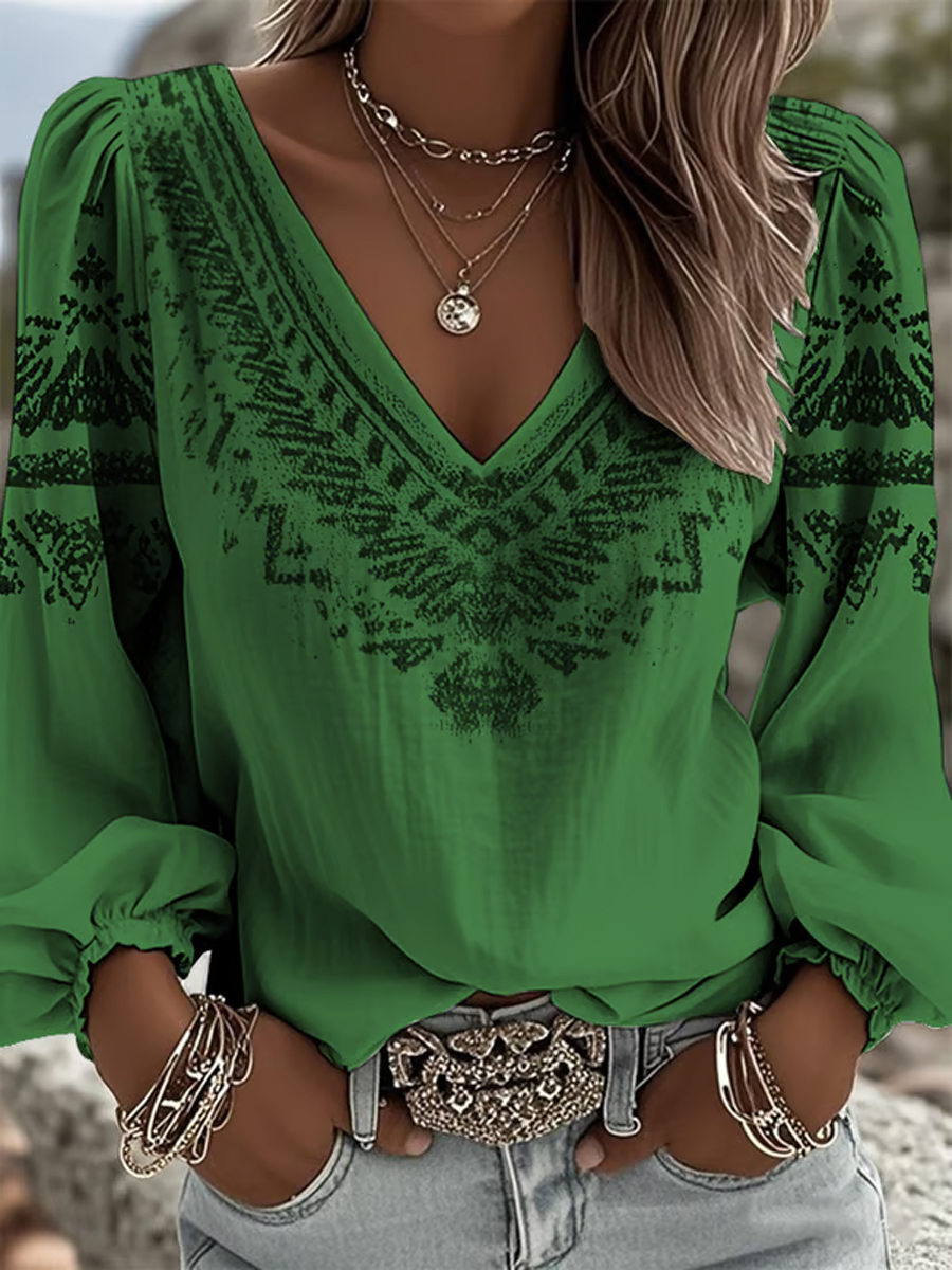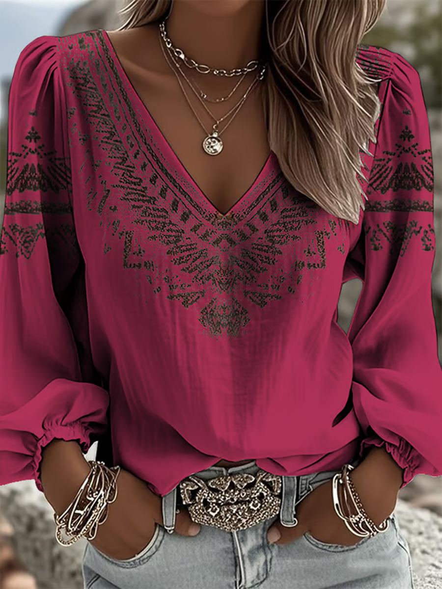 Women's Vintage Western Style V-Neck Long Sleeve Top